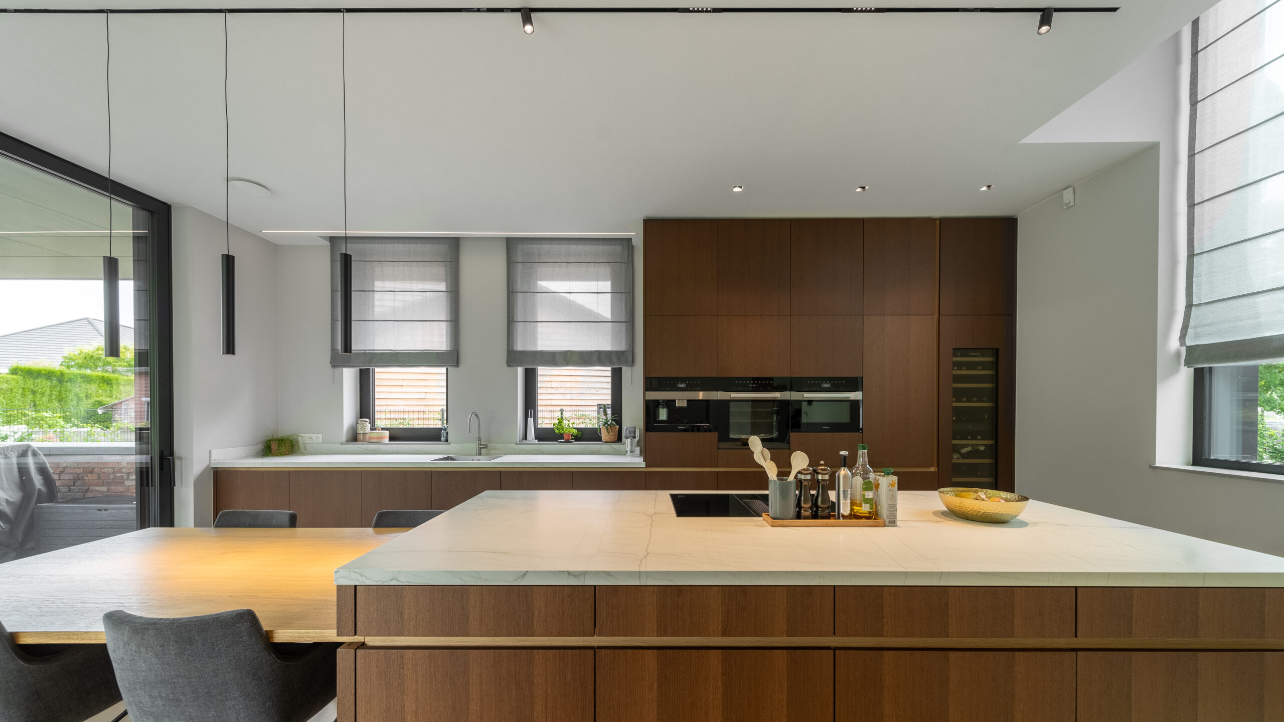 Warm minimalisme: In de keuken en leefruimtes kozen we voor een palet van warm eikenhout en lichte, tactiele materialen. Het grote kookeiland met zijn marmer-getekend blad vormt een sculpturaal middelpunt, terwijl kamerhoge kastenwanden in donker fineer voor de nodige diepte en visuele rust zorgen.