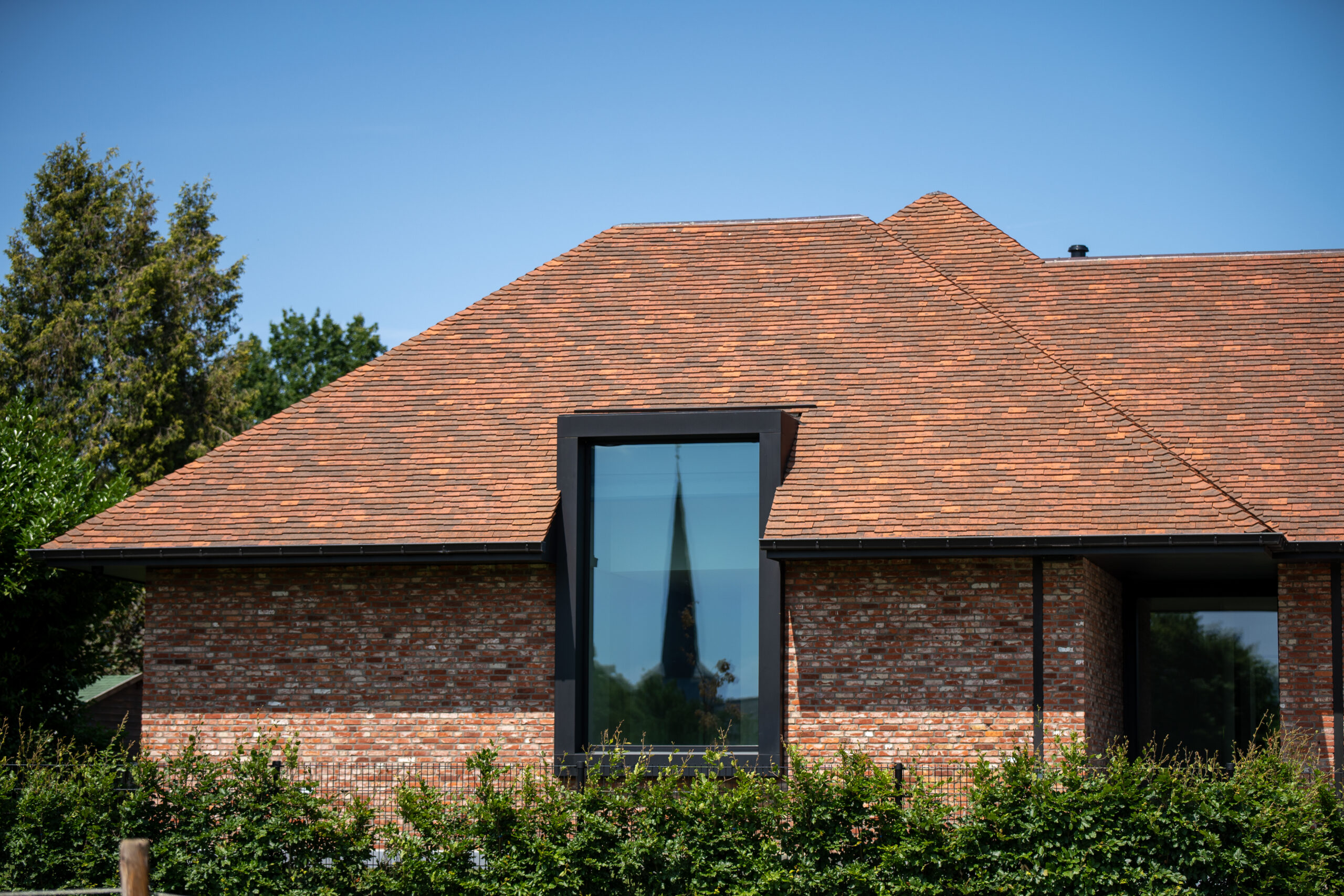 Kamerhoge raampartijen: De architectuur wordt gekenmerkt door enorme glasvlakken die de tuin en de kerktoren naar binnen halen. We hebben het interieur zo georganiseerd dat de zithoek en de keuken optimaal profiteren van dit panoramische zicht, waardoor de seizoenen de sfeer in huis bepalen.