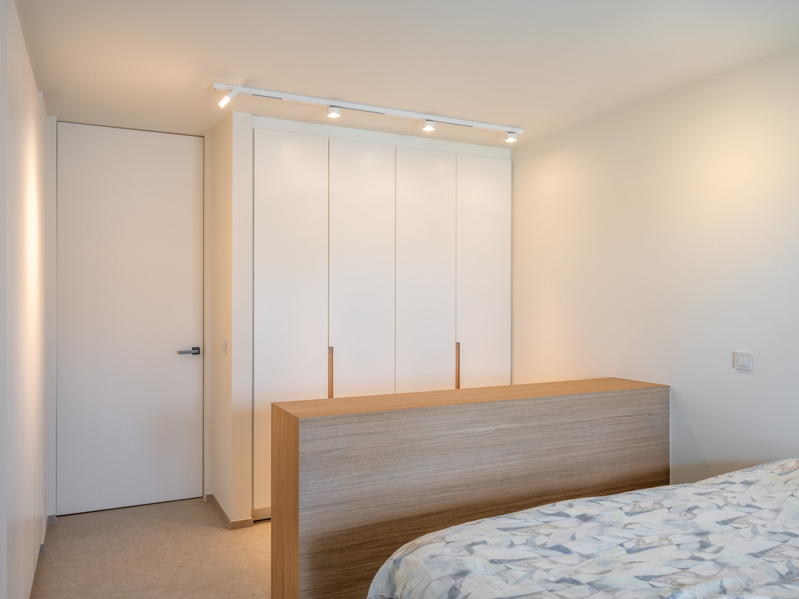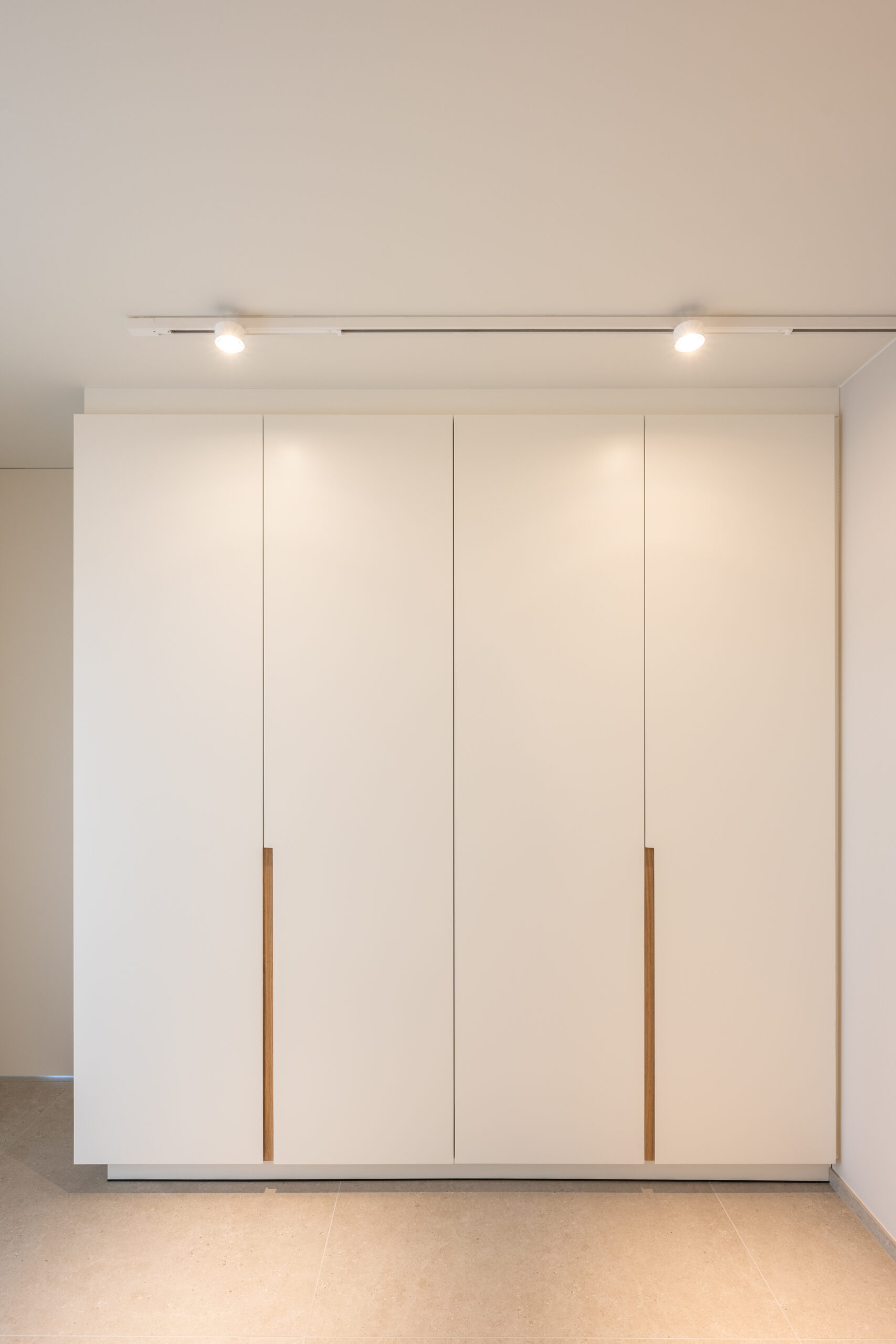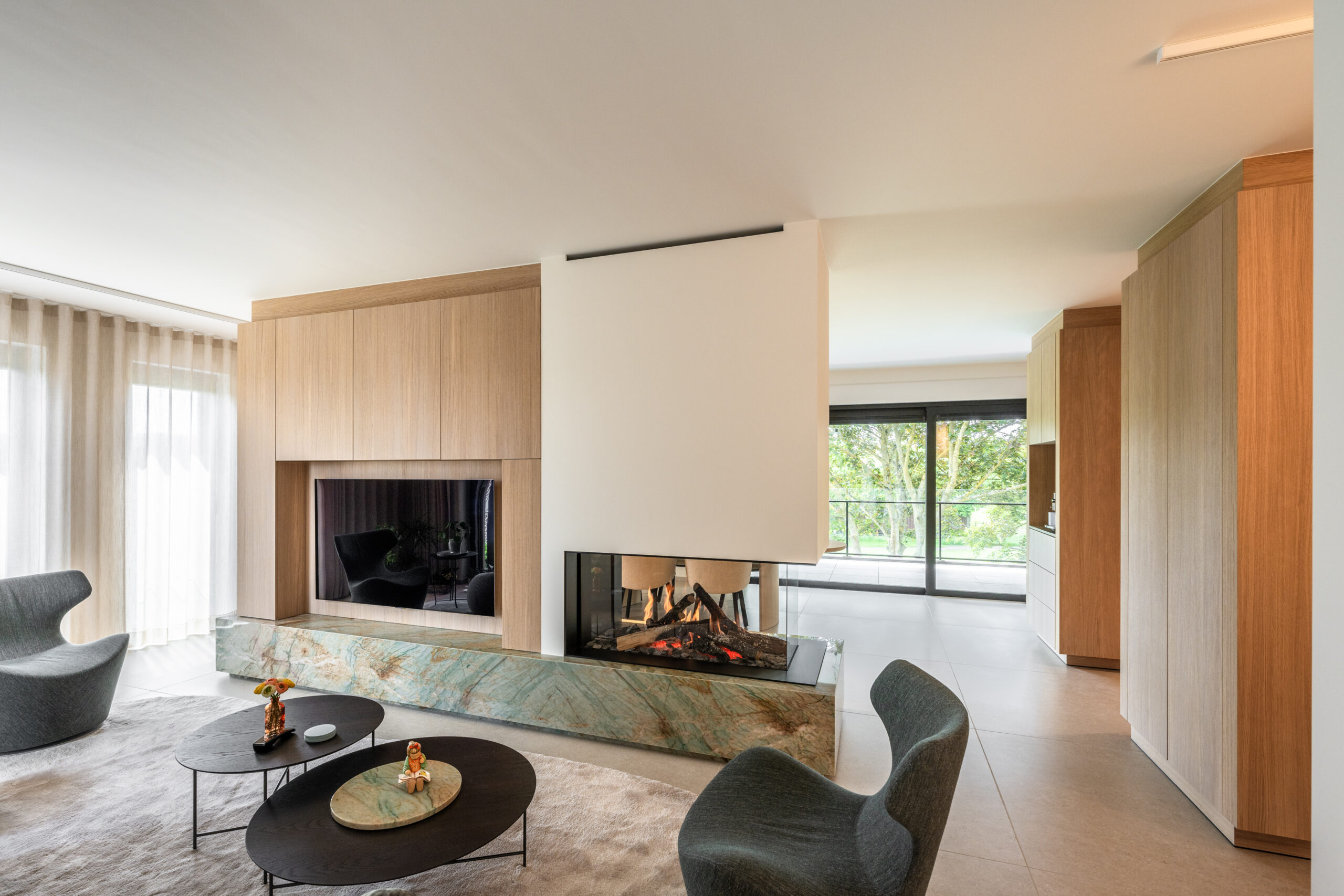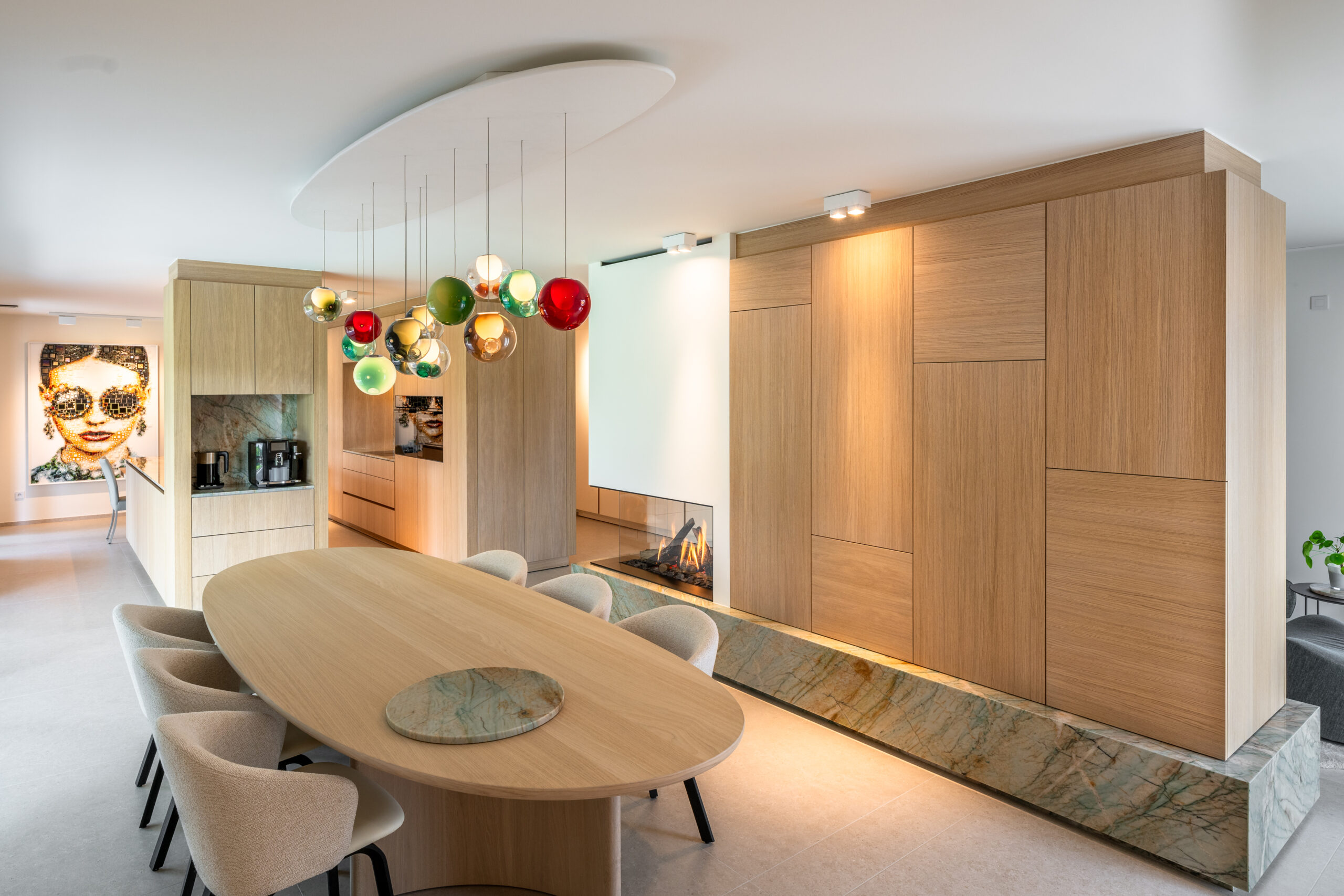 Warmte in eiken fineer: Om de openheid van het penthouse te verzachten, hebben we gewerkt met kamerhoge kastenwanden en wandbekleding in eiken fineer. Deze houten accenten zorgen voor een optimale akoestiek en een warme, natuurlijke gloed, waardoor de ruimte direct uitnodigt tot onthaasten.