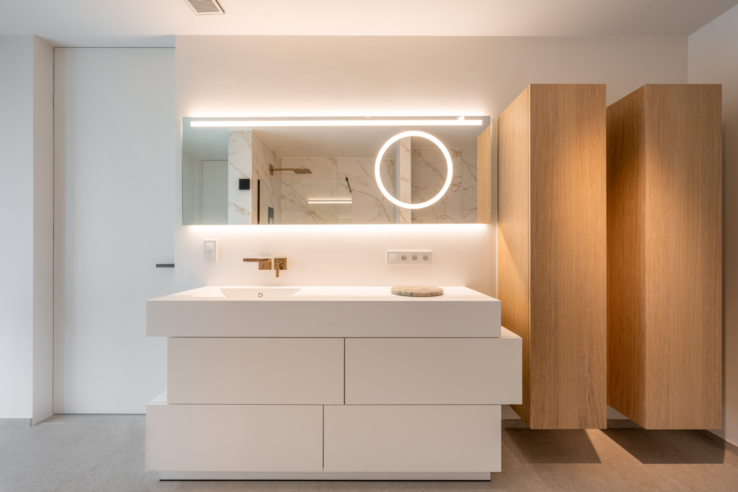 Naadloze overgang naar privé: De luxueuze esthetiek stopt niet bij de leefruimte. In de badkamers kozen we voor de strakke, zijdezachte afwerking van Corian in combinatie met marmer-keramiek. Hierdoor vloeien de verschillende zones naadloos in elkaar over en ontstaat er een rustgevend hotelgevoel in eigen huis.