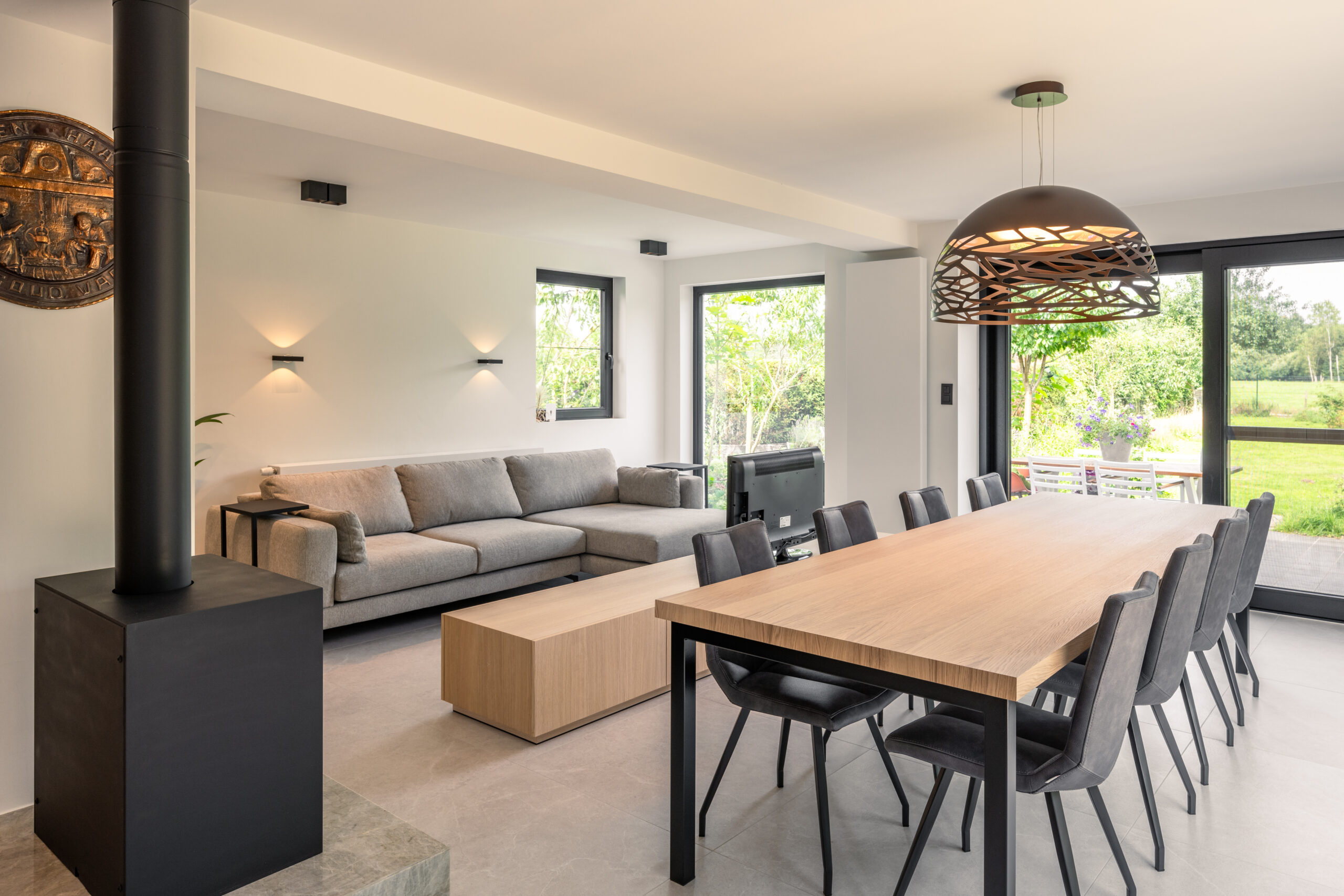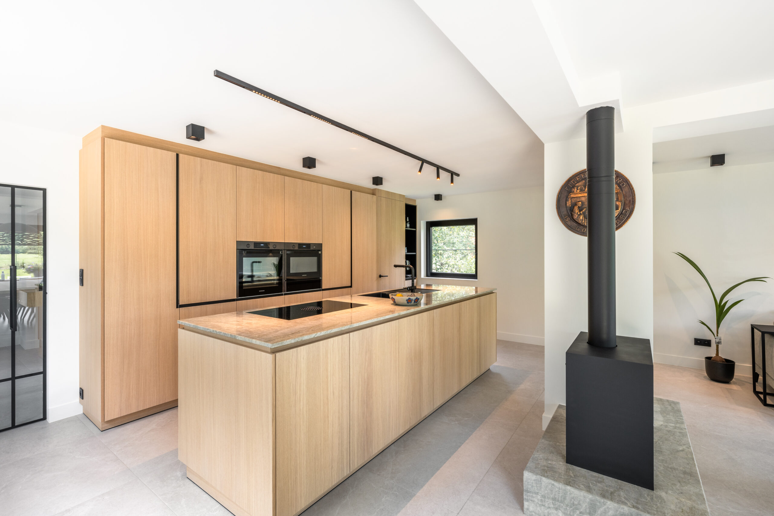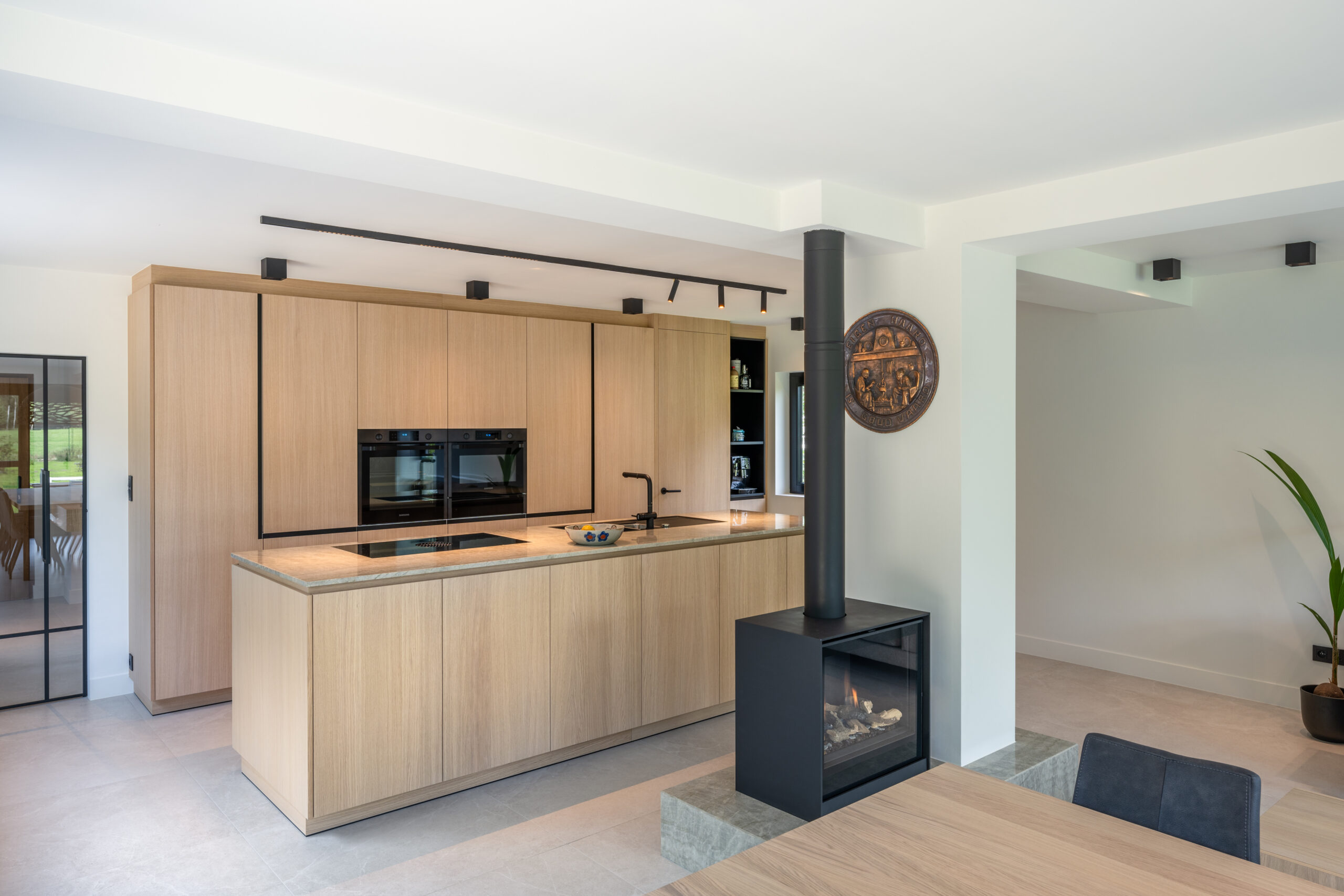 Het centrale blok: In het hart van de woning plaatsten we een multifunctioneel volume in warm eikenhout. Dit blok herbergt niet alleen de keuken en de haard, maar dient ook als visueel ankerpunt dat de verschillende zones, koken, eten en wonen, subtiel van elkaar scheidt zonder de openheid te breken.