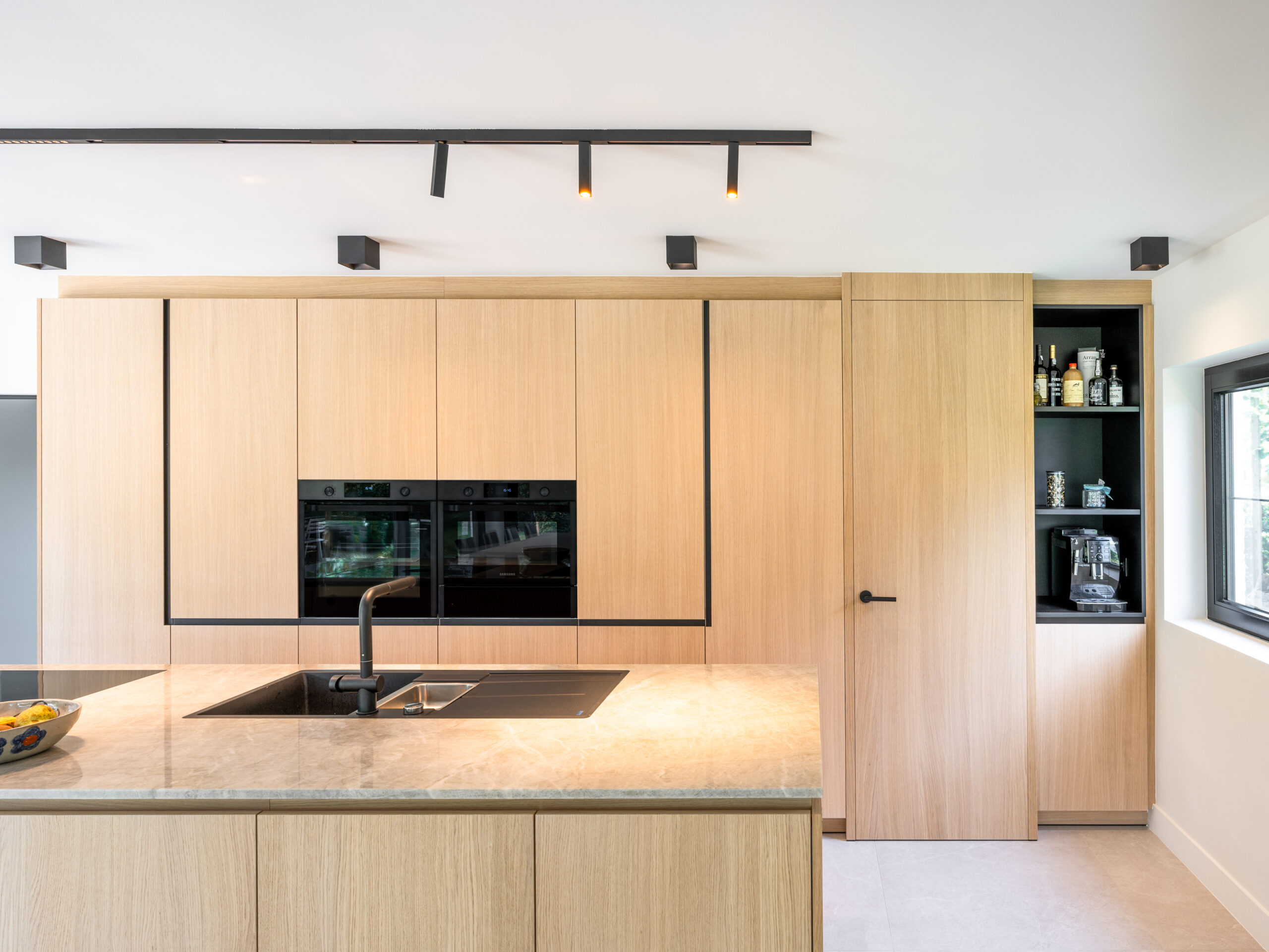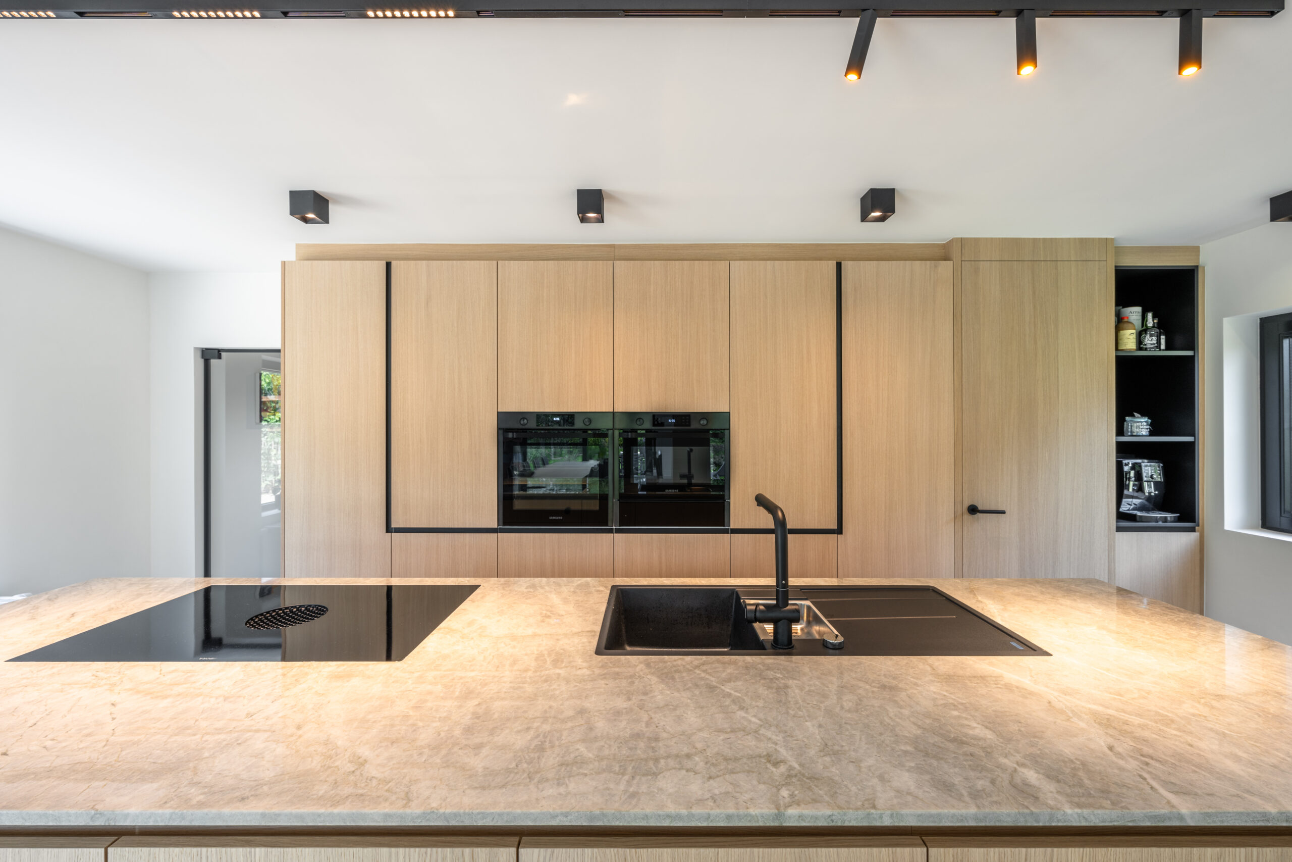 Taj Mahal kwartsiet: Als contrast voor de strakke witte keuken kozen we voor werkbladen en een spatwand in het exclusieve Taj Mahal kwartsiet. De zachte, bijna vloeibare adering van de natuursteen brengt een natuurlijke tactiliteit die perfect matcht met de houten details.