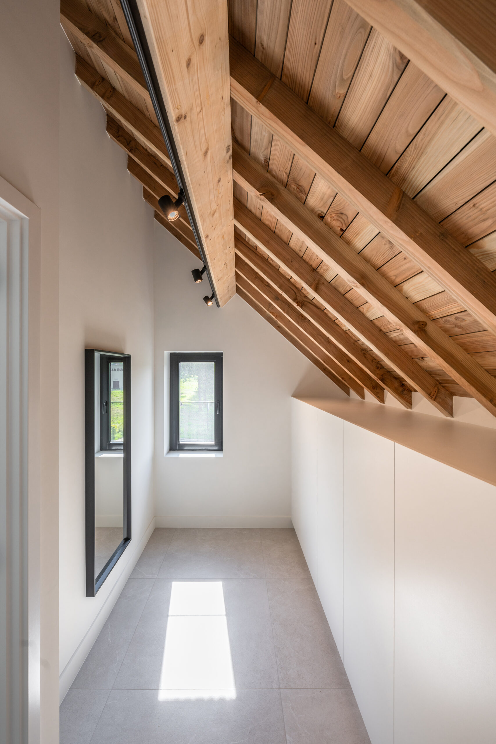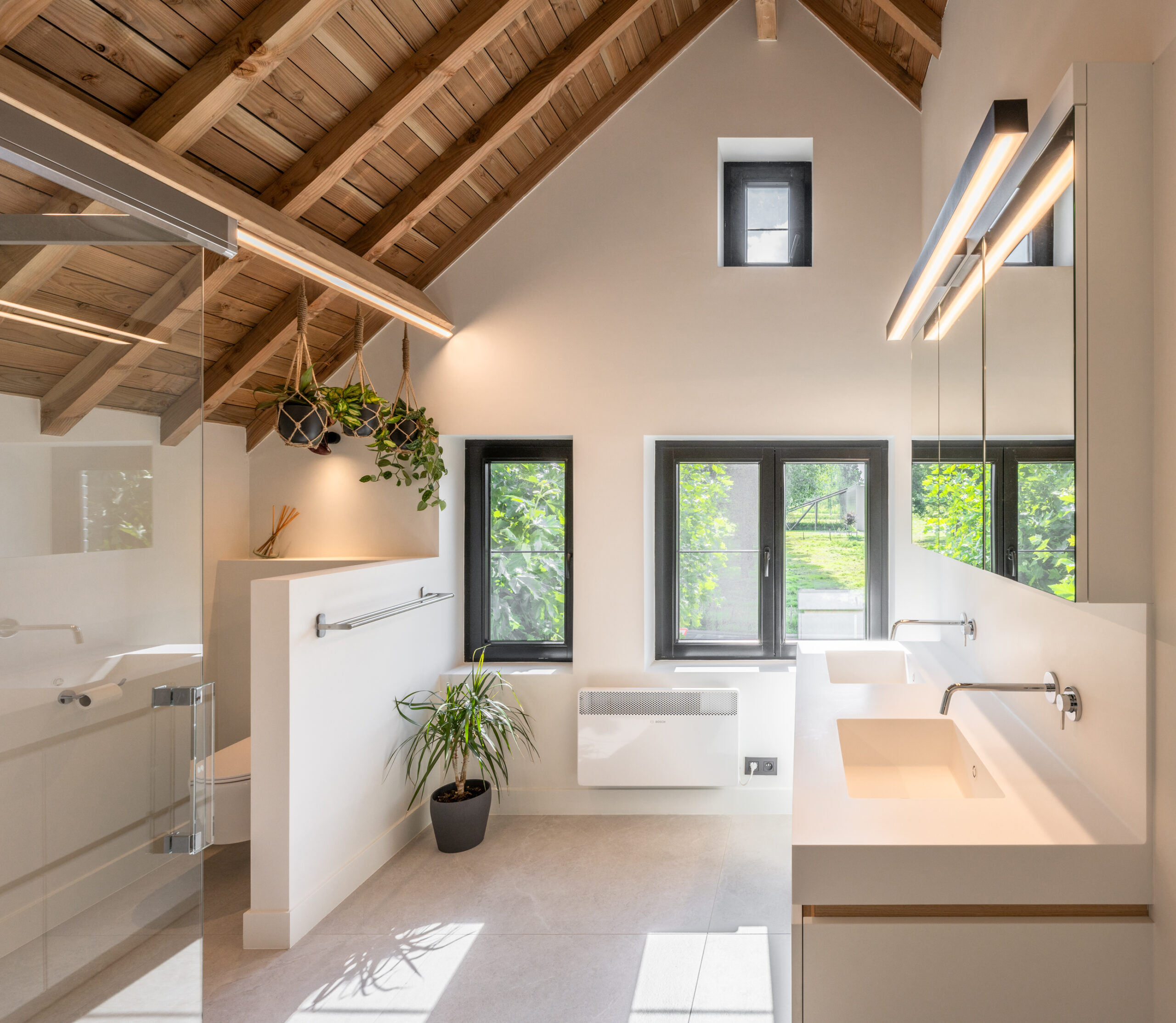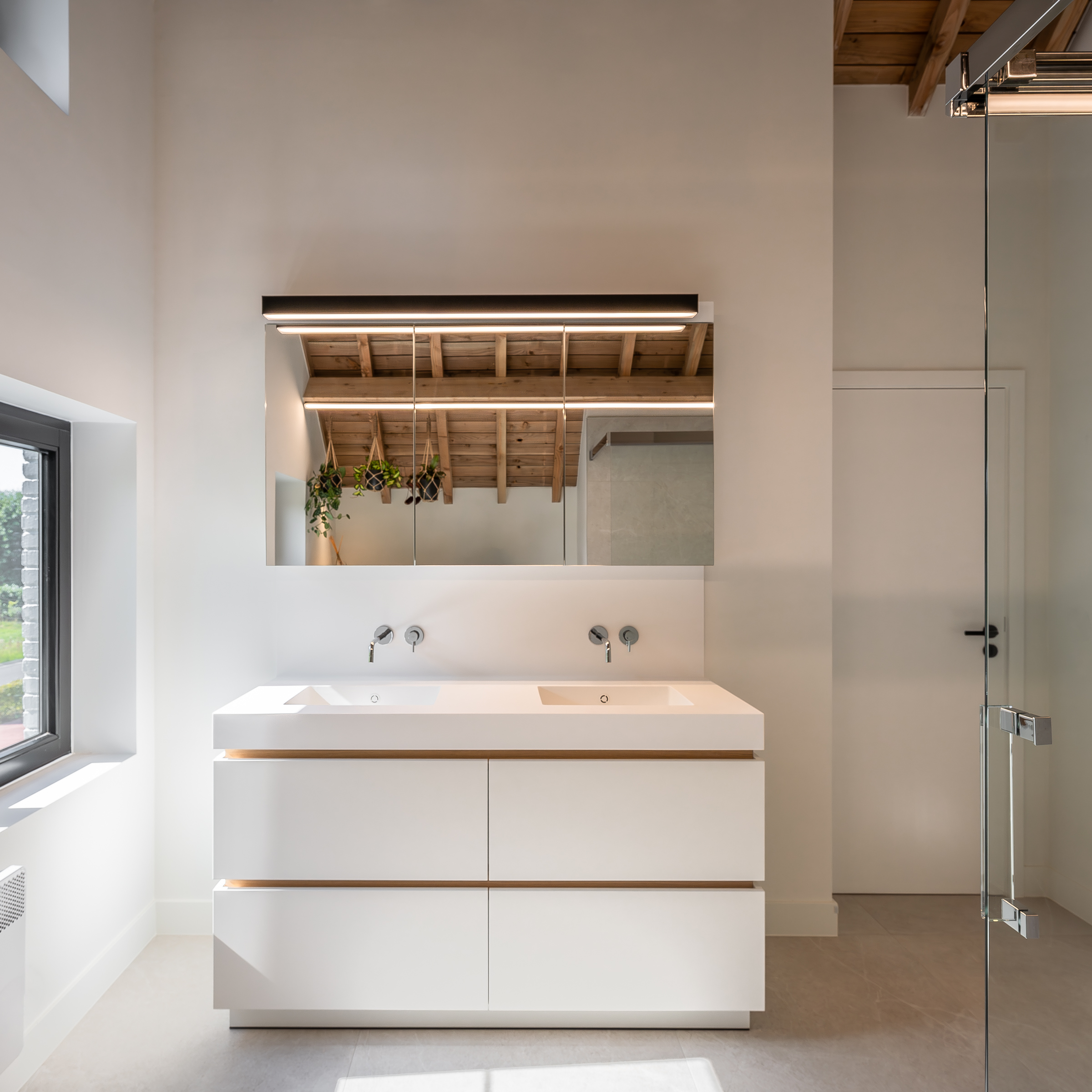 De renovatie in Hasselt is een meesterlijke transformatie waarbij de ziel van de jaren '50 behouden bleef, maar de leefkwaliteit naar het hoogste hedendaagse niveau is getild. De strakke vormgeving wordt overal verzacht door warme houtaccenten en doordachte details. Het is een thuis geworden waar elke ruimte uitnodigt tot rust, en waar de bewoners genieten van een moderne woonbeleving in een pand met geschiedenis.